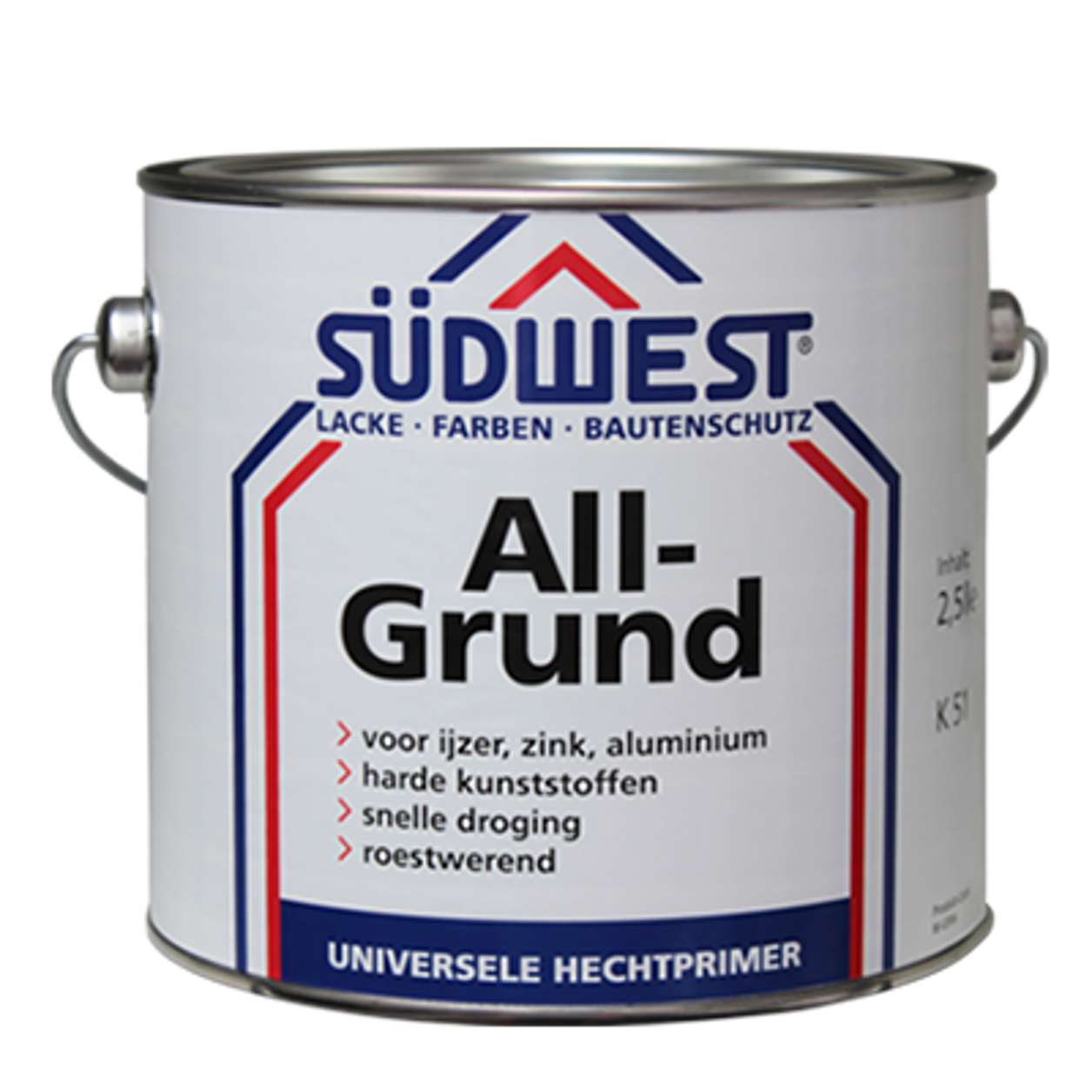 Sudwest allgrund is een oplosmiddelhoudende universele roestwerende primer voor o.a. op ijzer, staal, verzinkt staal, koper, kunststof, aluminium, trespa etc. Na droging is deze hechtprimer overschilderbaar met alle typen lakken, dus zowel één-component als twee-componenten watergedragen en synthetische lakken.