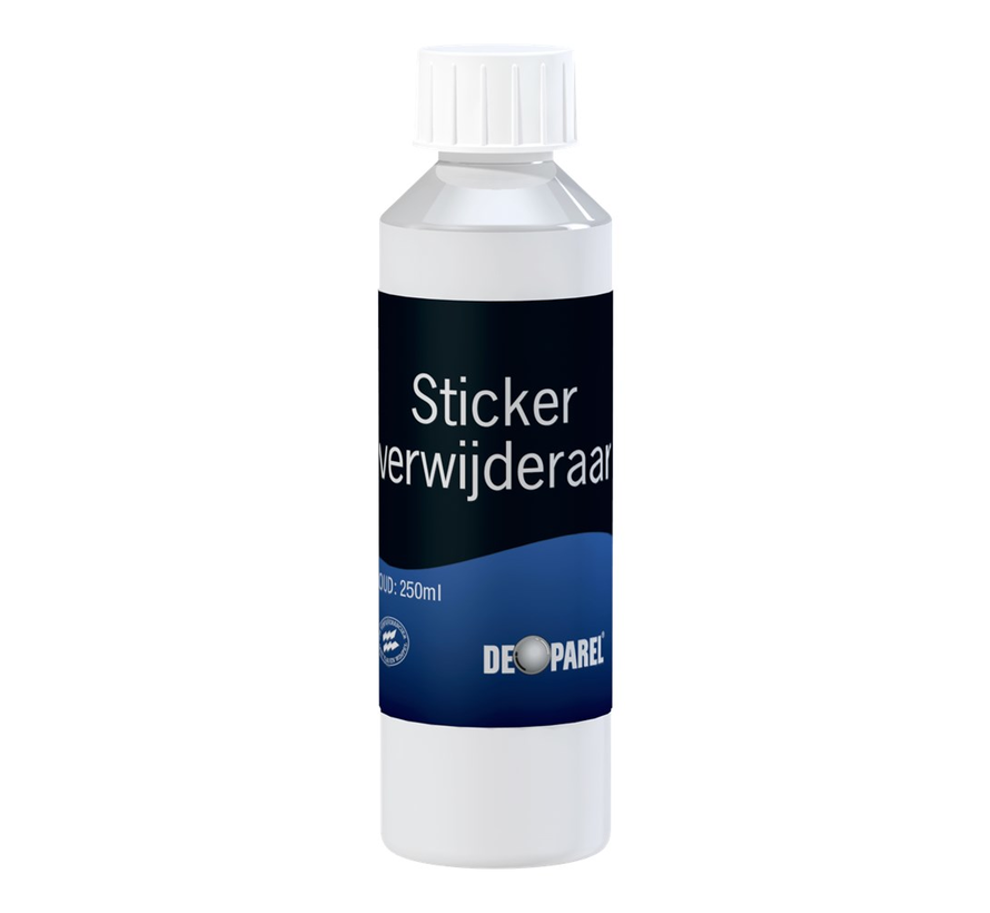 Met een stickerverwijderaar kan deze lijmlaag worden verwijderd door met een doekje gedrenkt in stickerverwijderaar de plek te behandelen.