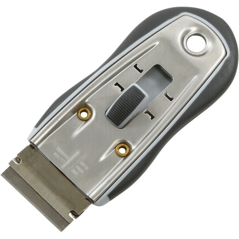 Professionele glaschraper, metalen houder met softgrip en uitschuifmechanisme, mes is vervangbaar.