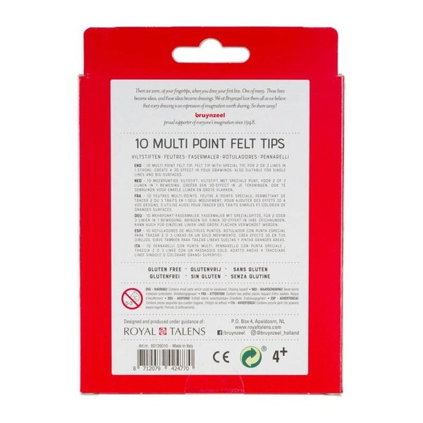 10 meerpuntige viltstiften. Viltstift met speciale punt, voor 2 of 3 lijnen in 1 beweging. Creëer een 3D-effect in je tekeningen. Ook te gebruiken voor enkele lijnen en grote vlakken.